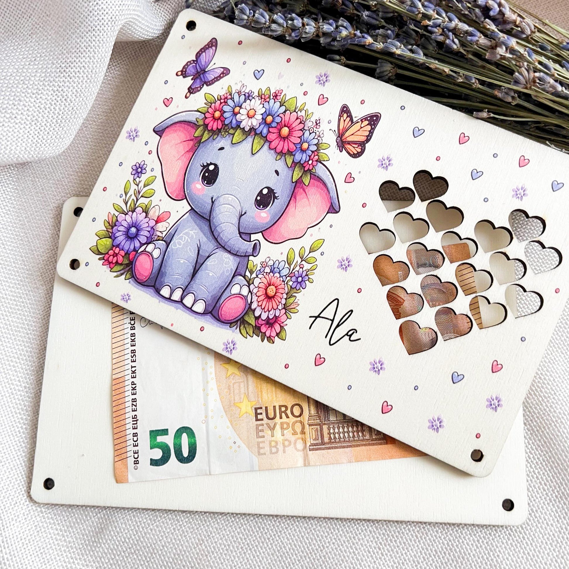 Suchst du nach einem originellen Geldgeschenk zum Geburtstag? Diese wunderschöne Holzkarte mit einem niedlichen Elefanten-Design ist eine liebevolle und kreative Überraschung für jedes Geburtstagskind!