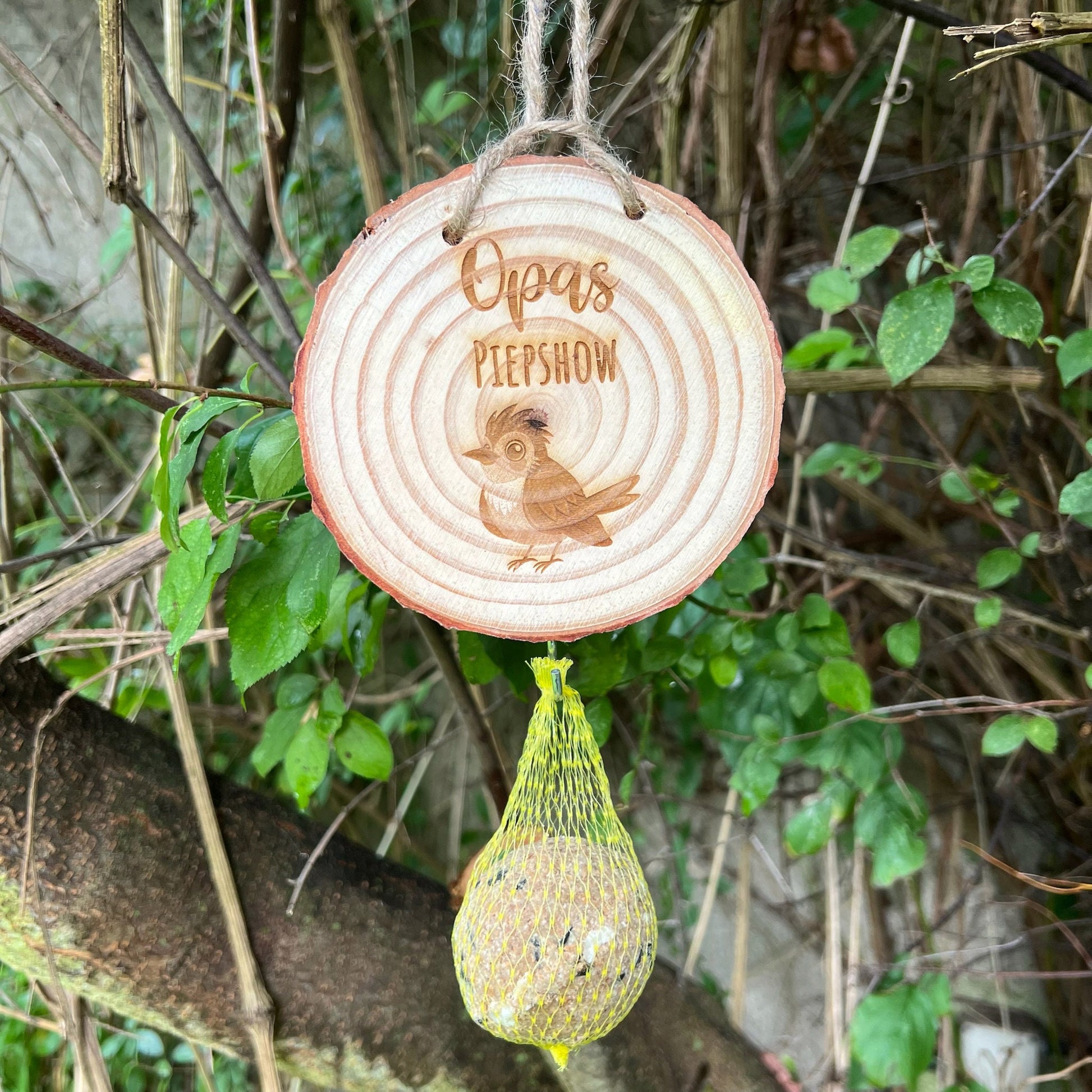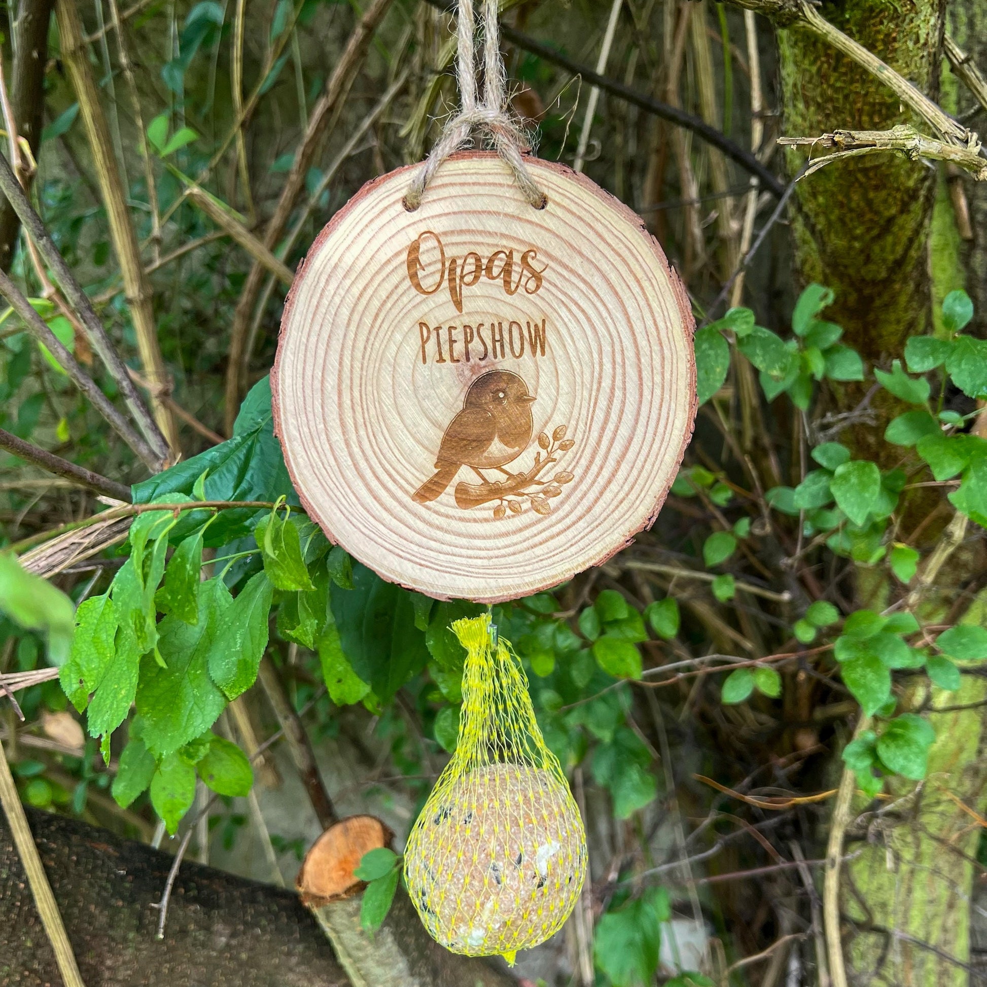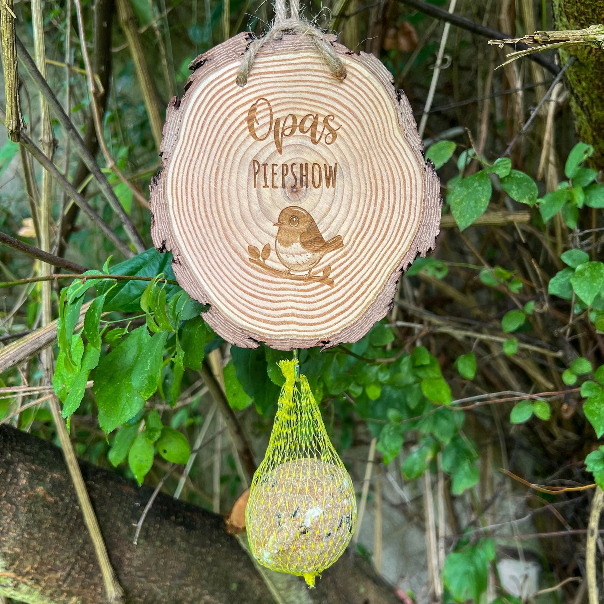Bringen Sie mit unserem einzigartigen Meisenknödelhalter "Opas Piepshow" Leben in Ihren Garten! Der charmante Vogelfutterhalter wird aus einer natürlichen Baumscheibe gefertigt, mit einem Durchmesser von ca. 12-14 cm und einer Dicke von 15 mm.