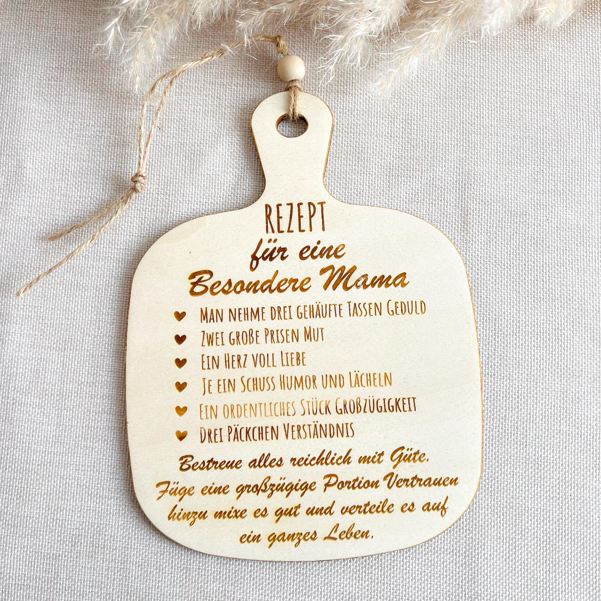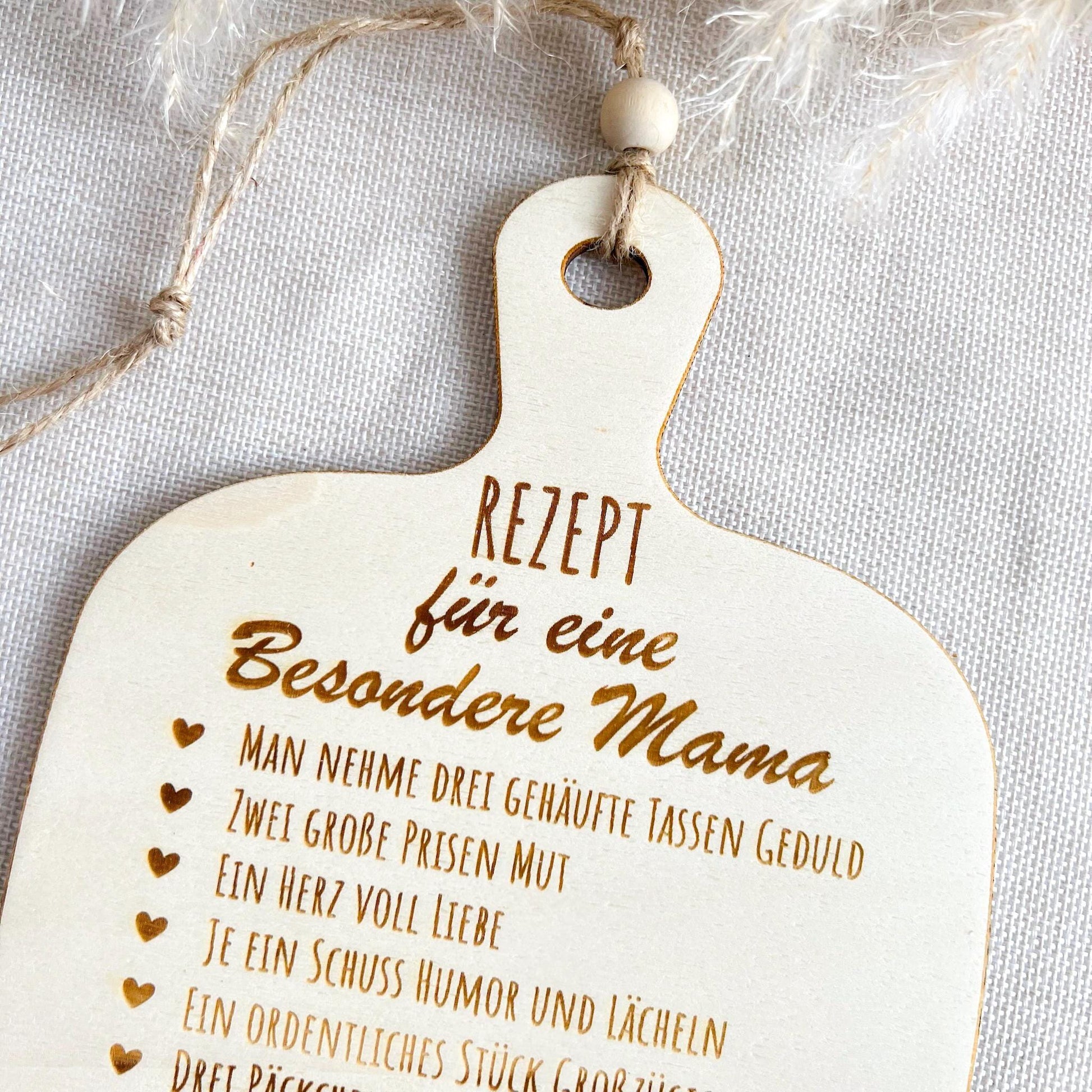 Überraschen Sie Ihre Mama zum Muttertag oder Geburtstag mit unserem liebevollen Rezept für eine besondere Mama“! Dieses einzigartige Holzornament in Schneidebrettform ist das perfekte Geschenk, um Ihre Wertschätzung zu zeigen.