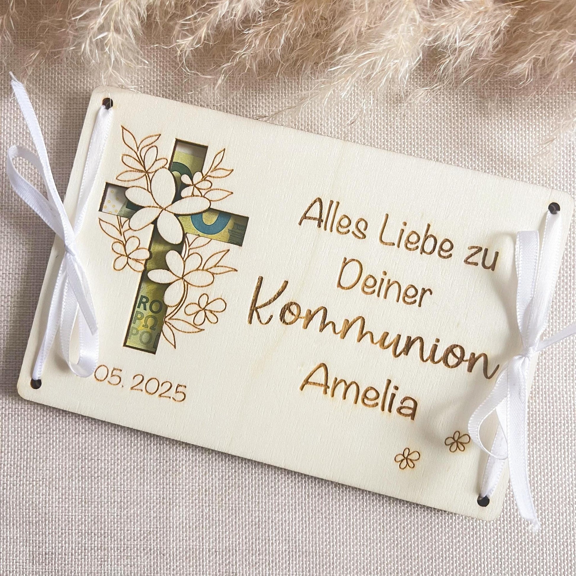 Personalisierung: Name und Kommunionsdatum werden individuell graviert, um die Karte ganz persönlich zu gestalten.