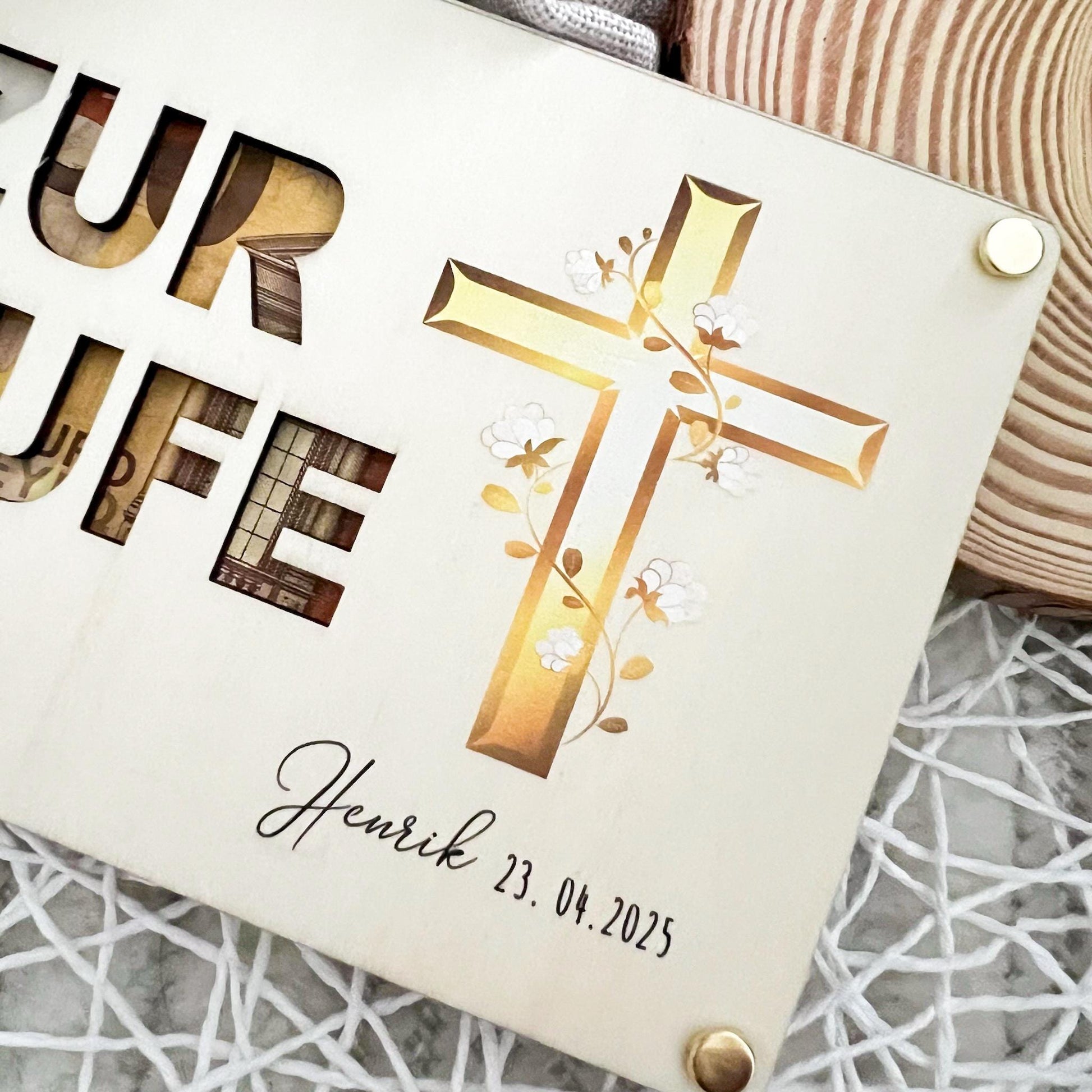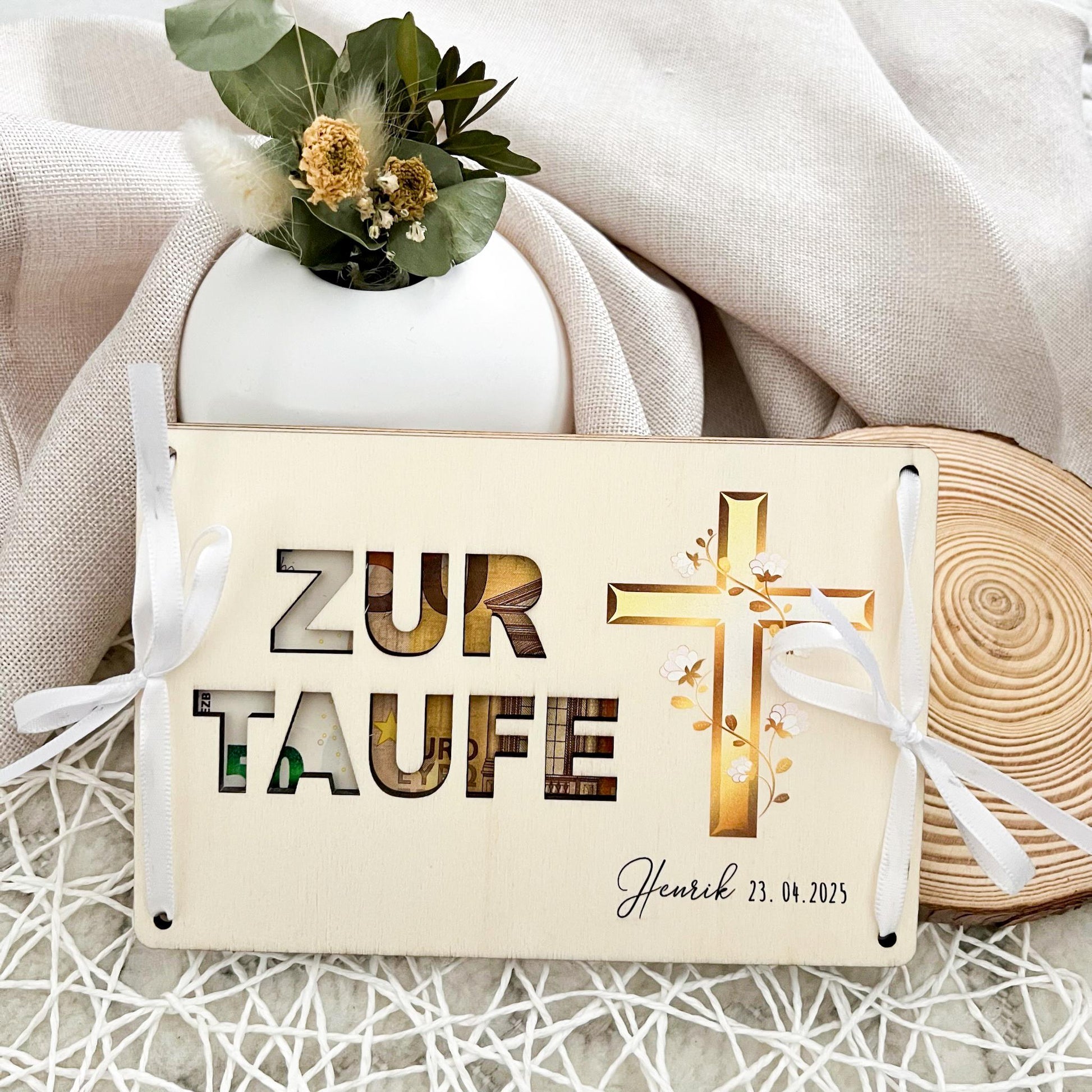 Personalisiertes Taufgeschenk Geldgeschenk-Karte aus Holz mit Namen & Datum